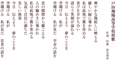 「埼玉県立戸田翔陽高等学校」は、埼玉県立戸田高等学校全日制、埼玉県立浦和商業高等学校定時制、埼玉県立与野高等学校定時制、埼玉県立蕨高等学校定時制の合併に伴い、三部制・総合学科・単位制・2学期制の学校として2005年に創立された。埼玉県からの委嘱を受け、河合尚市が同校校歌の作詞と作曲を担当。